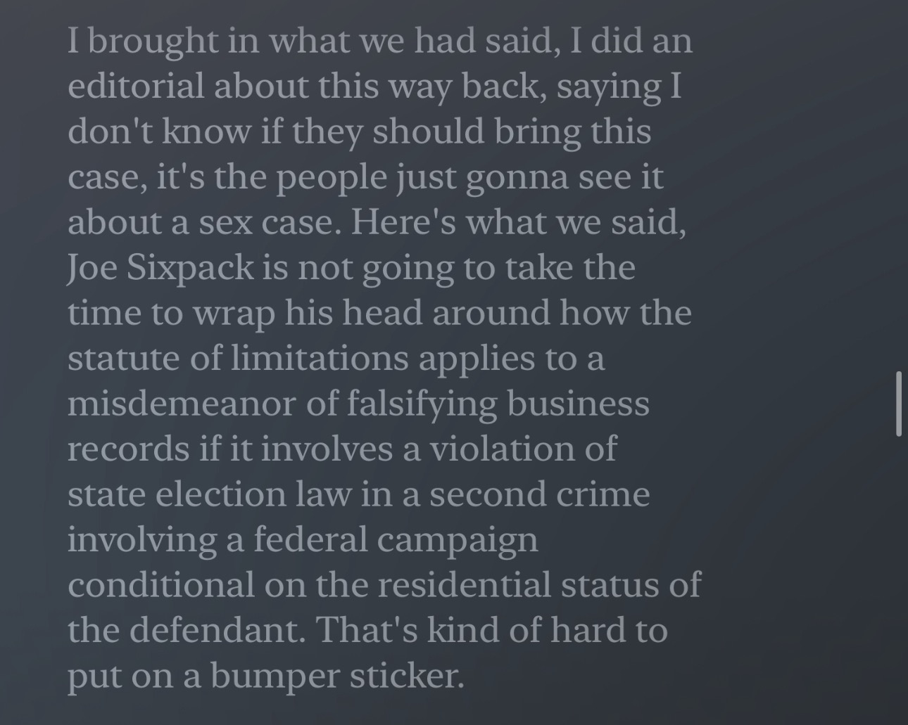 I brought in what we had said, I did an editorial about this way back, saying I don’t know if they should bring this case, it’s the people just gonna see it about a sex case. Here’s what we said, Joe Sixpack is not going to take the time to wrap his head around how the statute of limitations applies to a misdemeanor of falsifying business records if it involves a violation of state election law in a second crime involving a federal campaign conditional on the residential status of the defendant. That’s kind of hard to put on a bumper sticker.